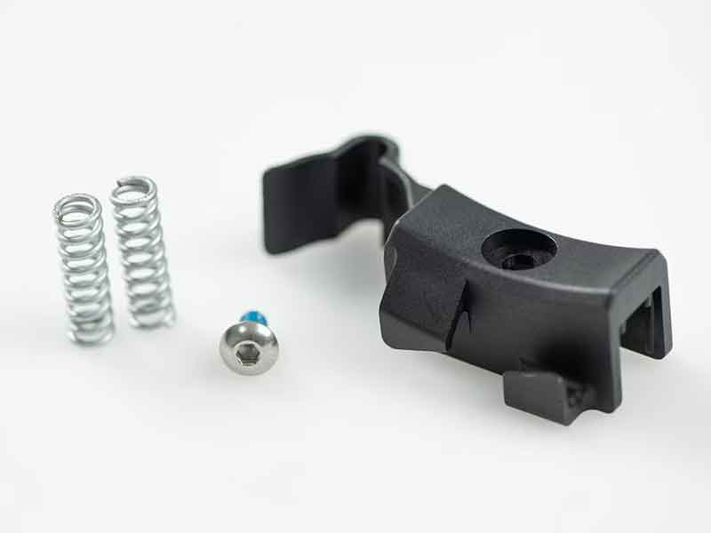 BROMPTON Gラインの折りたたみ状態を維持する樹脂パーツです。このブロックがシート・ピラーに当たることで、リア三角の動きをロックをします。ボルトで水平方向のセッティングを調整して、シート・ピラーのあたりを最適に調整します。