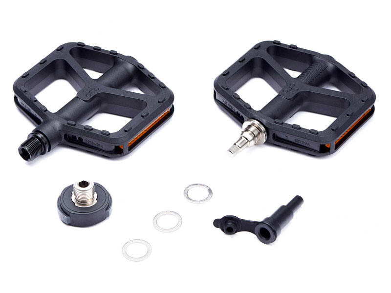 左右のペダル本体と、取り付け時に使うスペーサー、左側のマウント・アダプター、フロント・フォーク裏にパーキングするためのアダプターのセットです。