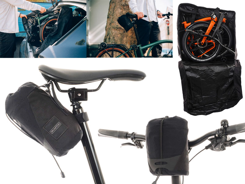 純正サドルやハンドルバーに装着可能な収納ポーチと、BROMPTON本体に取り付けて肩掛けするためのショルダー・ストラップが付属しています。