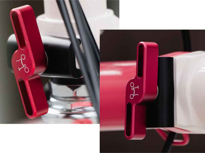 BROMPTON Cherry Blossom(チェリー・ブロッサム)2025年モデルに採用されているヒンジ・クランプ・レバーです。Pラインに採用されている「ブロンプトン・アルミニウム・ヒンジ・クランプ」の赤・バージョンで、ヒンジ・クランプ・プレートは含みません。